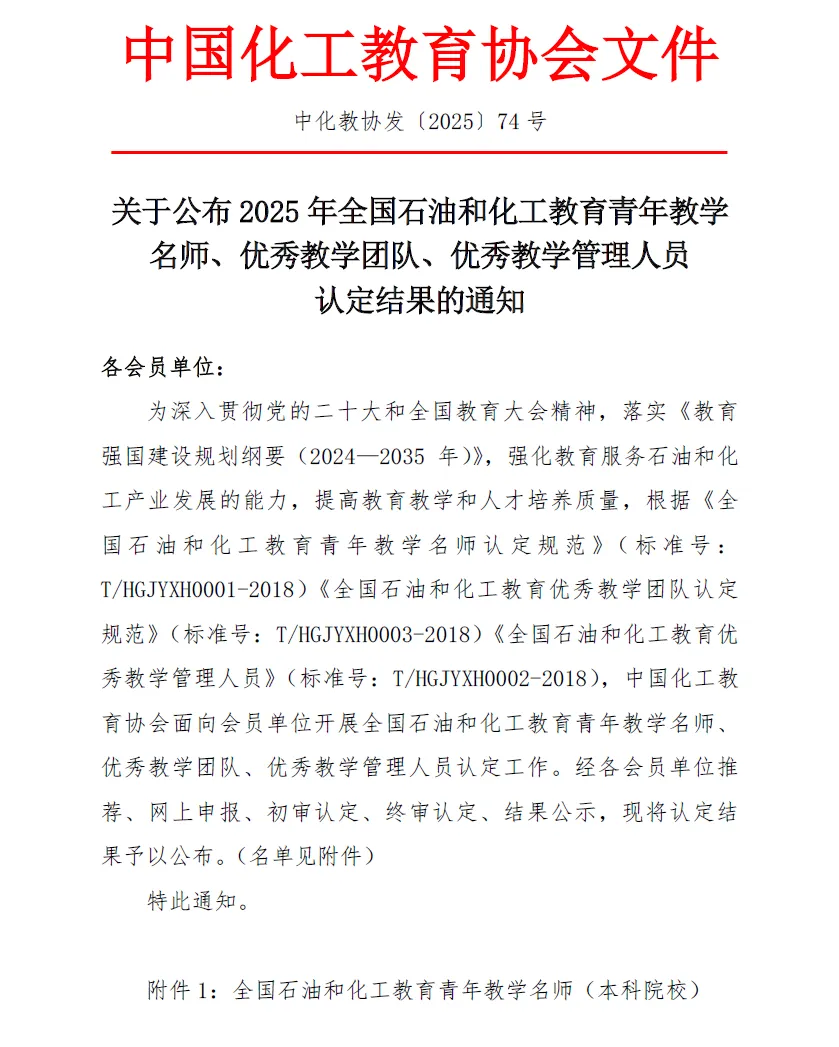 1人获评“全国石油和化工教育青年教学名师”,制药类专业人才培养教学创新团队获评“全国石油和化工教育优秀教学团队”,彰显了我校高水平师资队伍的育人风采。