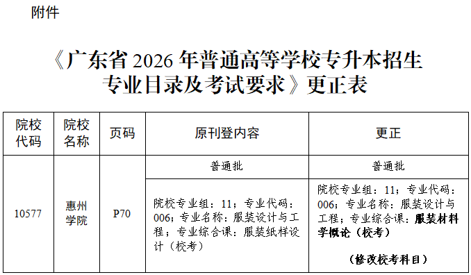 应惠州学院要求,现对《广东省2026年普通高等学校专升本招生专业目录及考试要求》部分内容作如下更正(见附件)。