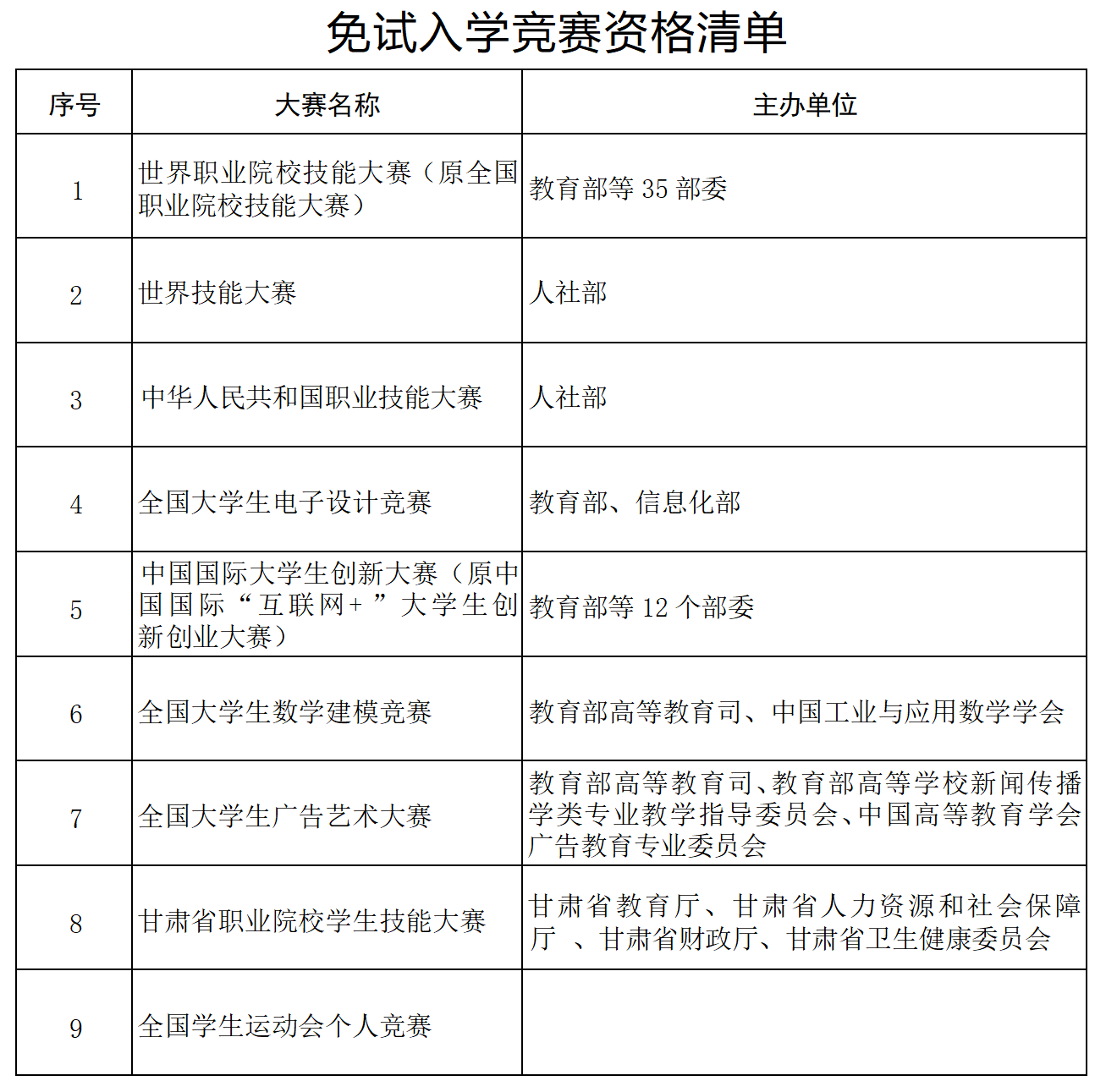 3.全国学生运动会个人竞赛项目中进入前3名的应届毕业生。在教育部高等教育司和行业主管部门共同主办的数学建模竞赛、广告艺术大赛(高职组)中获得个人或团体国家三等奖及以上的应届毕业生(附件2)。