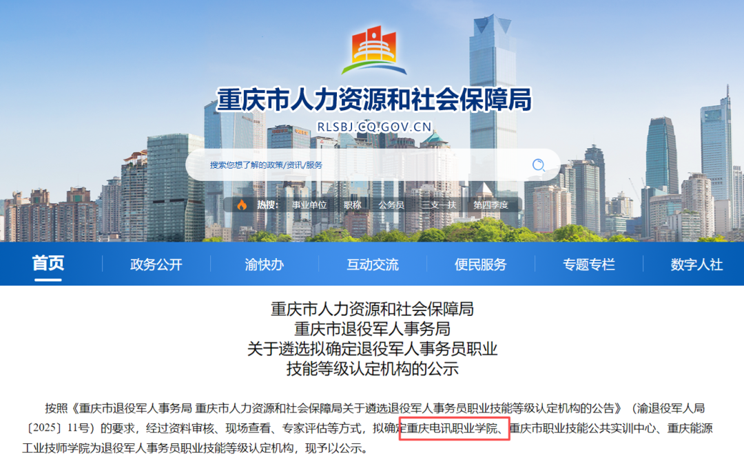 近日,我校成功通过退役军人事务部评审,获批成为“重庆市退役军人事务员职业技能等级认定机构”。全市仅有三所单位获此资格,我校位列其中。