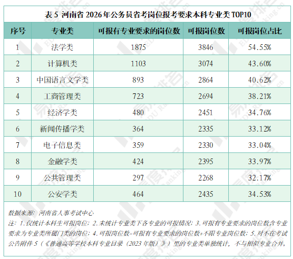 河南省2026年公务员招录岗位对本科生的专业要求统计显示,在招录本科生的岗位中,1971个岗位未设置专业限制。专业类可报考岗位数统计结果表明,法学类本科生可报考1875个有专业要求的岗位,叠加不限专业岗位后,其可报考岗位占比达54.55%,居各专业类之首。计算机类与中国语言文学类紧随其后,可报考岗位占比均超40%。从前十类专业来看,经管、政法及文学相关专业在公务员招录中仍保持优势地位,理工科中计算机类与电子信息类专业亦表现突出,可报考岗位数量可观。