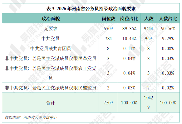 下表展示了2026年河南省公务员招录岗位对政治面貌的要求情况。其中对政治面貌无要求的岗位占比为89.35%,要求中共党员的岗位占比10.44%,要求中共党员或共青团员的岗位仅有8个,占比0.11%,此外,另有8个岗位要求为非中共党员(若是民主党派成员,需满足指定党派要求)。