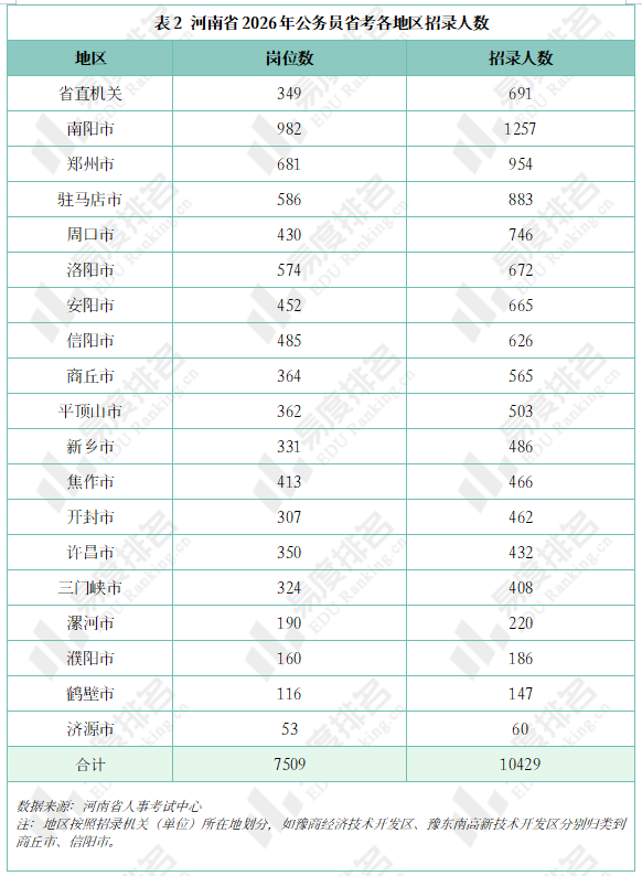 2026年河南省公务员共有7509个岗位招录,总计招收10429人。同国家公务员考试政策一致,河南省公务员报考资格条件调整年龄要求为18周岁以上、38周岁以下(1987年1月至2008年1月期间出生),应届硕士、博士研究生放宽到43周岁以下(1982年1月以后出生)。