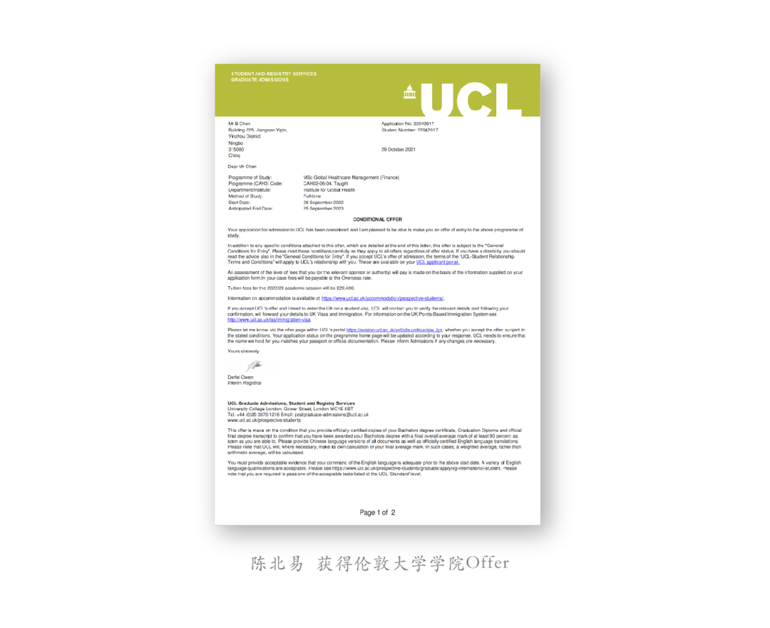 当伦敦大学学院硕博连读录取通知书出现在邮箱时,陈北易特意翻出自己大一时的四级模拟卷—一那张被红叉密布的答题卷,静静地躺在桌上,与眼前这份来自世界名校的录取函形成了鲜明的对照。