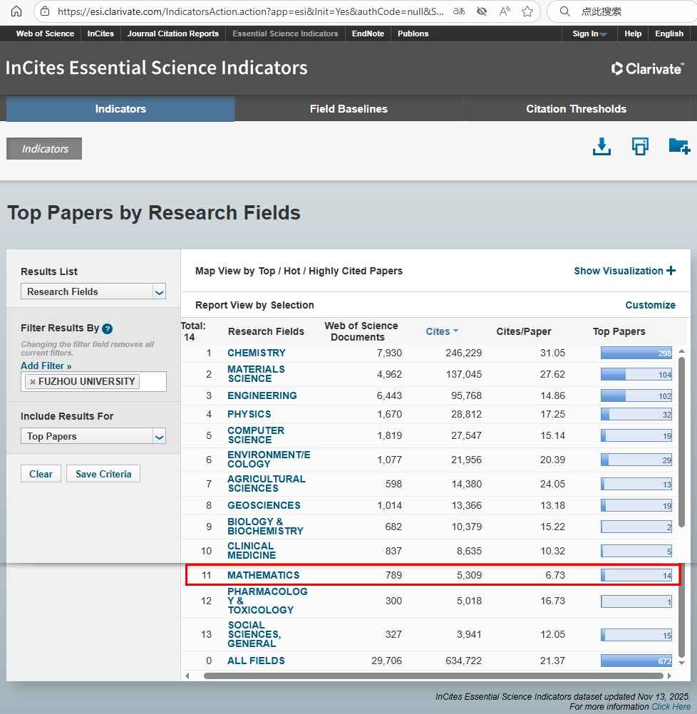 根据科睿唯安2025年11月更新的ESI数据显示,福州大学数学学科首次进入ESI全球前1%行列。目前,学校共有13个学科进入ESI全球前1%,其中化学、工程学和材料科学3个学科进入ESI全球排名前1‰,入选ESI全球前1‰和1%的学科数均居福建省属高校第一。