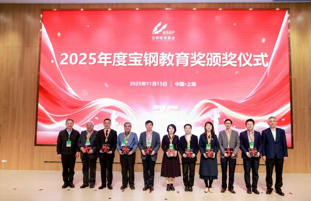 于岩教授(中)荣获宝钢优秀教师特等奖