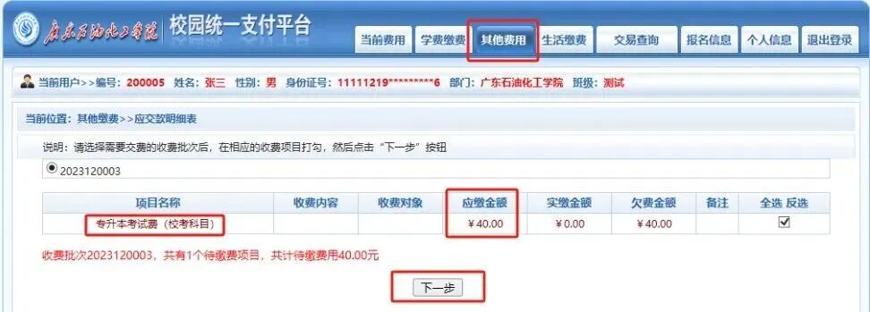 第四步:登录系统后,点击“其他费用”,确认项目“专升本考试费”和应缴金额,点击“下一步”。