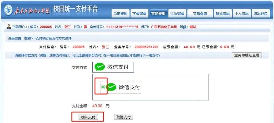 2.选择缴费方式后,使用手机微信扫描二维码后,请认真核对收款方名称,收款方为广东石油化工学院。