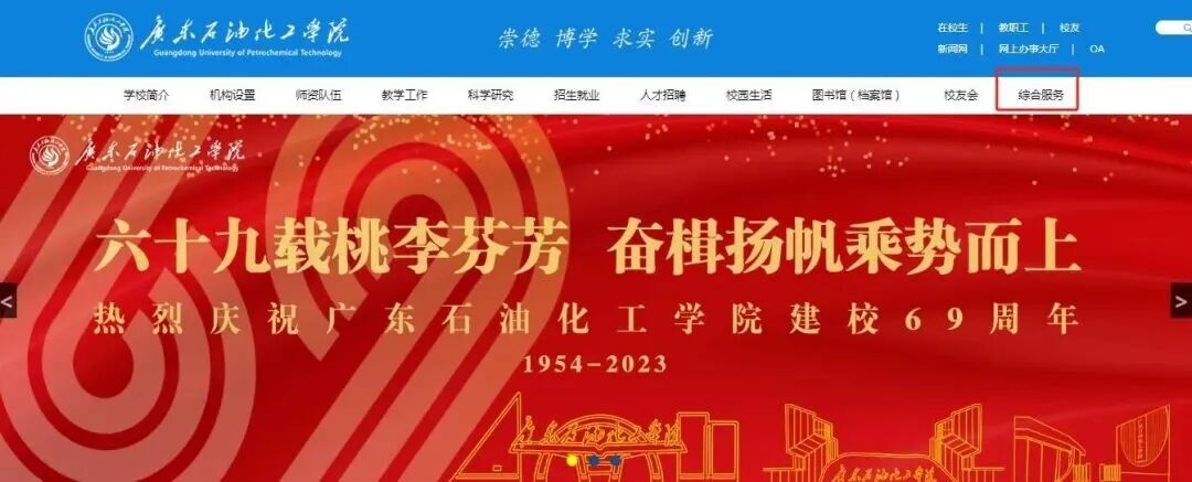 第一步:登录广东石油化工学院官网(https://www.gdupt.edu.cn/),点击右上角“综合服务”。