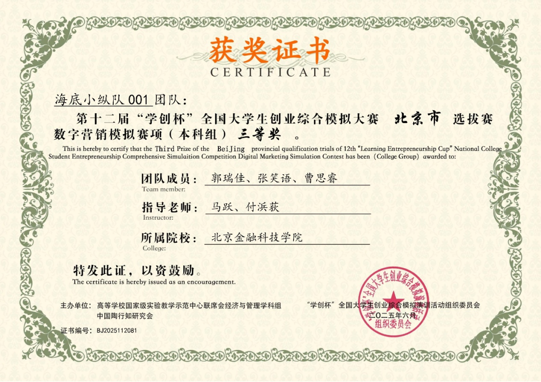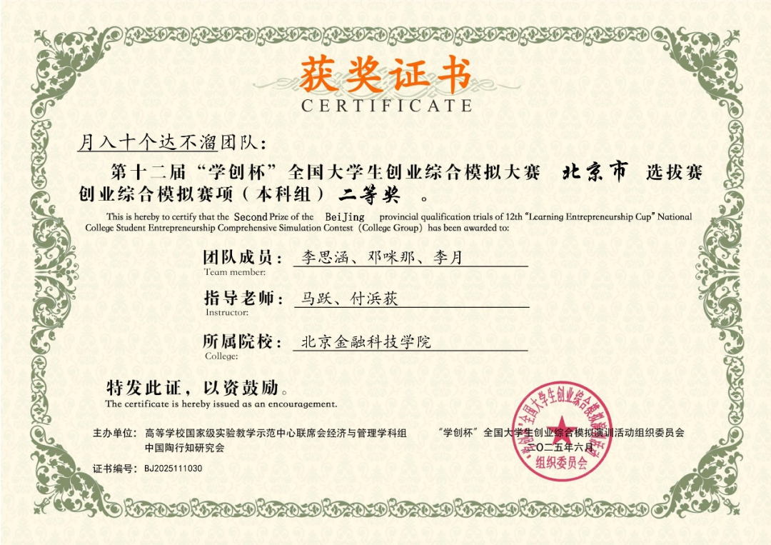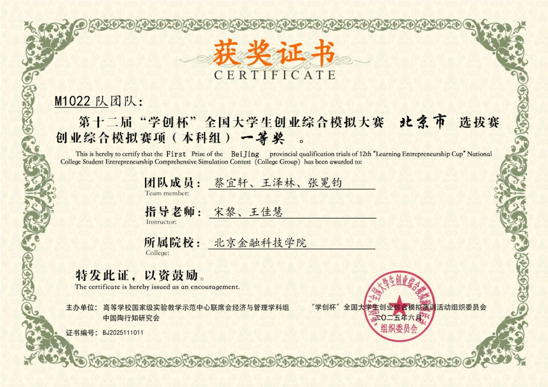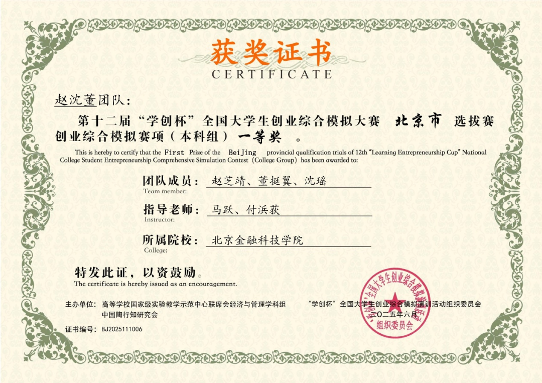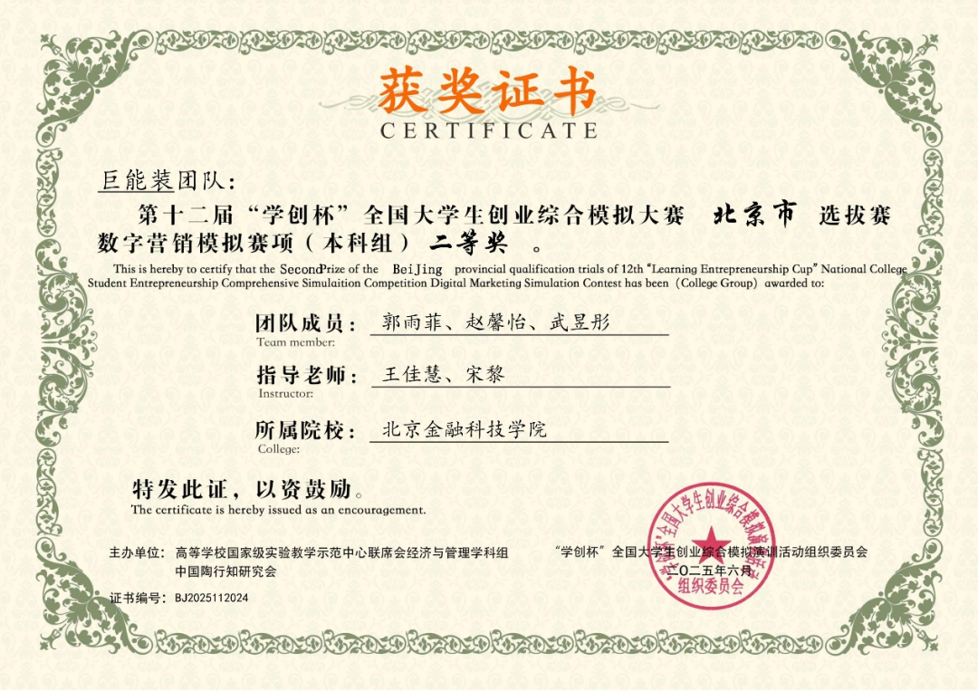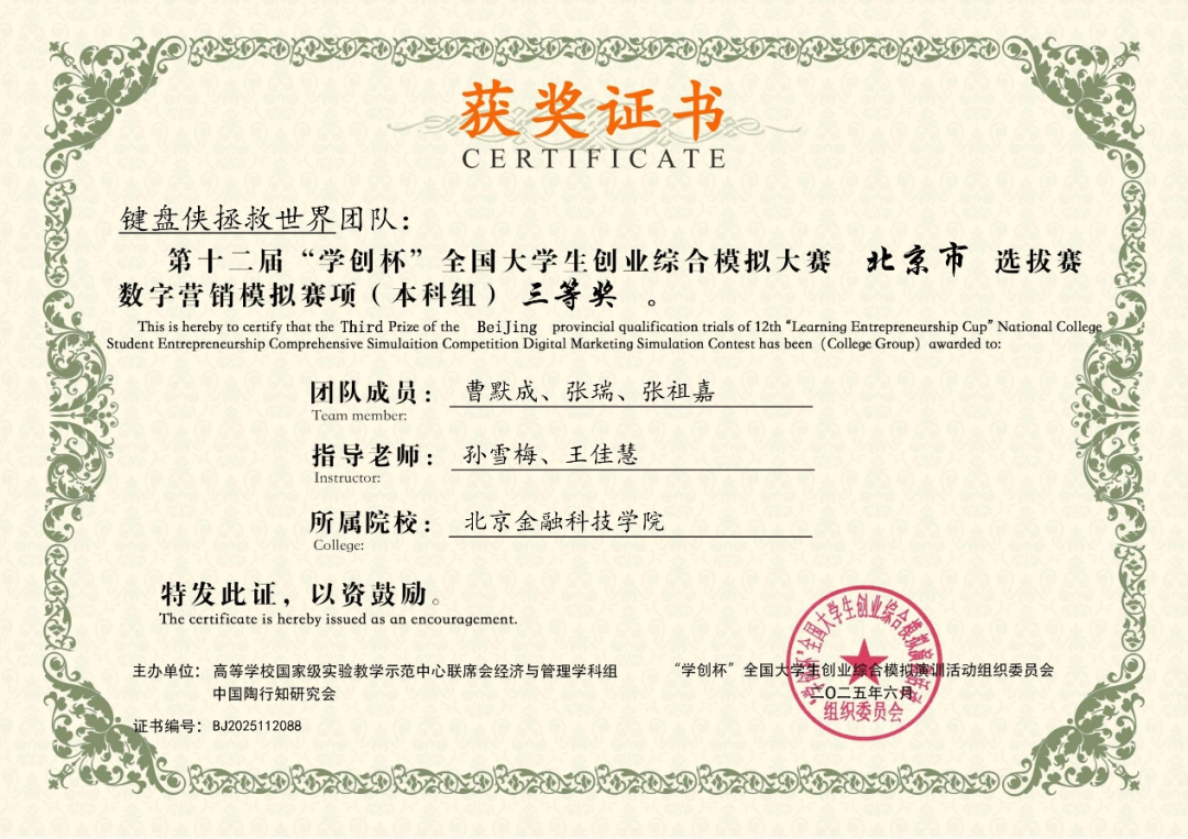 日前,在第十二届“学创杯”全国大学生创业综合模拟大赛北京市选拔赛中,北京金融科技学院学子表现卓越,凭借扎实的专业知识、出色的团队协作和敏锐的商业决策能力,在创业赛道荣获一等奖3项、二等奖2项;营销赛道荣获一等奖2项、二等奖1项、三等奖2项,创下我校在该项赛事中的历届最多奖项,充分展现了我校学子的综合实力和风采。
