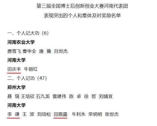 2025年10月28日,田庆丰团队获全国博士后创新创业大赛金奖。田庆丰老师获河南省人力资源和社会保障厅记大功奖励,对李谦、田路露授予记功奖励。