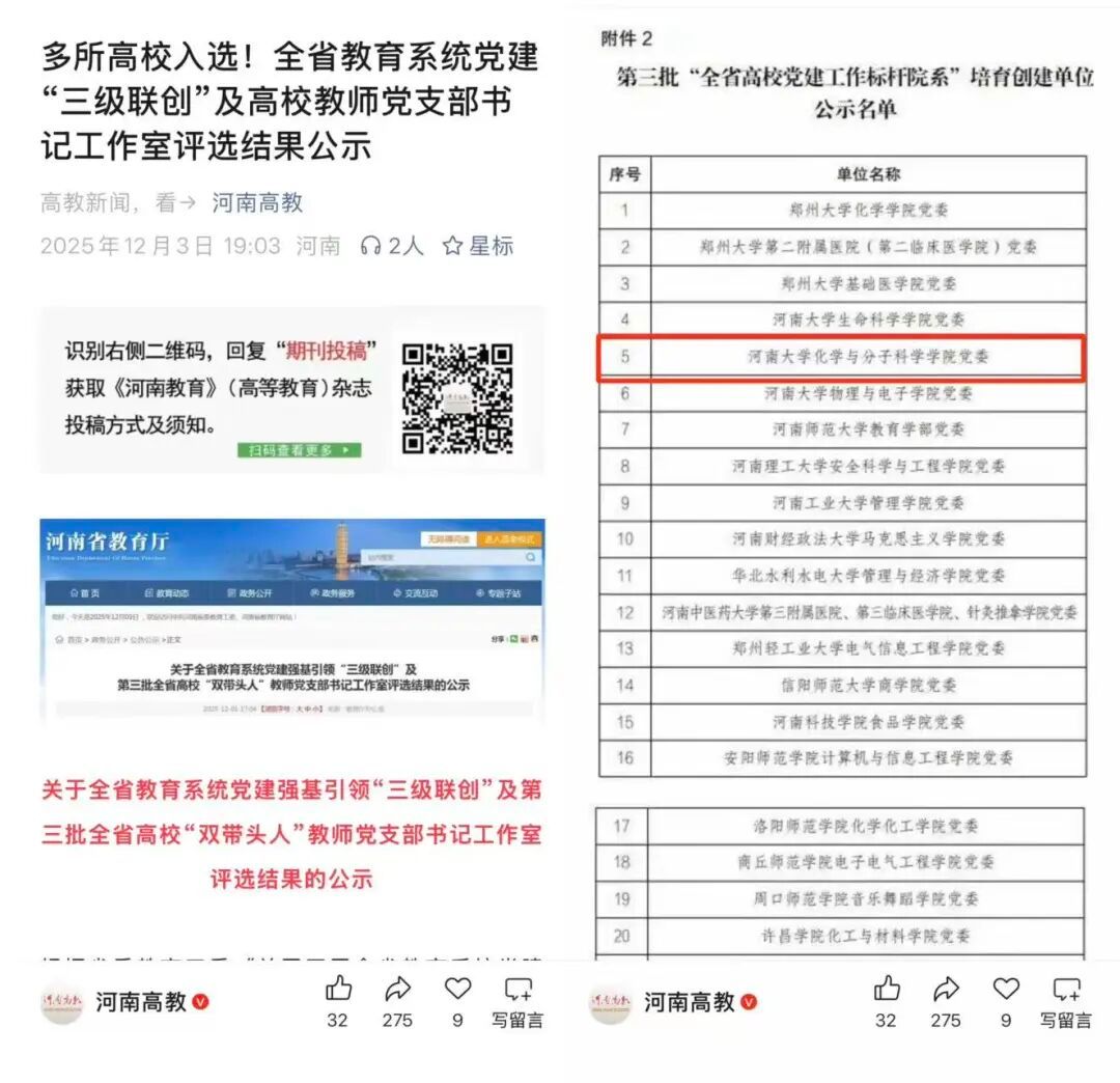 2025年12月3日,学院党委入选河南省第三批“全省高校党建工作标杆院系”培育创建单位。这既是对学院党委过往党建工作成效的高度肯定,彰显了其在思想引领、组织建设等方面的扎实成果,更为学院党建持续高质量发展注入了强大动力。