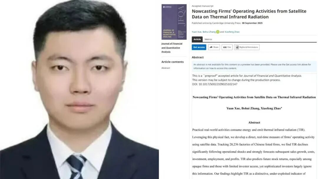 高级金融学院师资博士后薛原以第一作者身份,与香港中文大学(深圳)的张博辉教授、香港岭南大学的赵小峰副教授合作的论文Nowcasting Firms’ Operating Activities from Satellite Data on Thermal Infrared Radiation在金融学顶级期刊Journal of Financial and Quantitative Analysis线上正式发表。