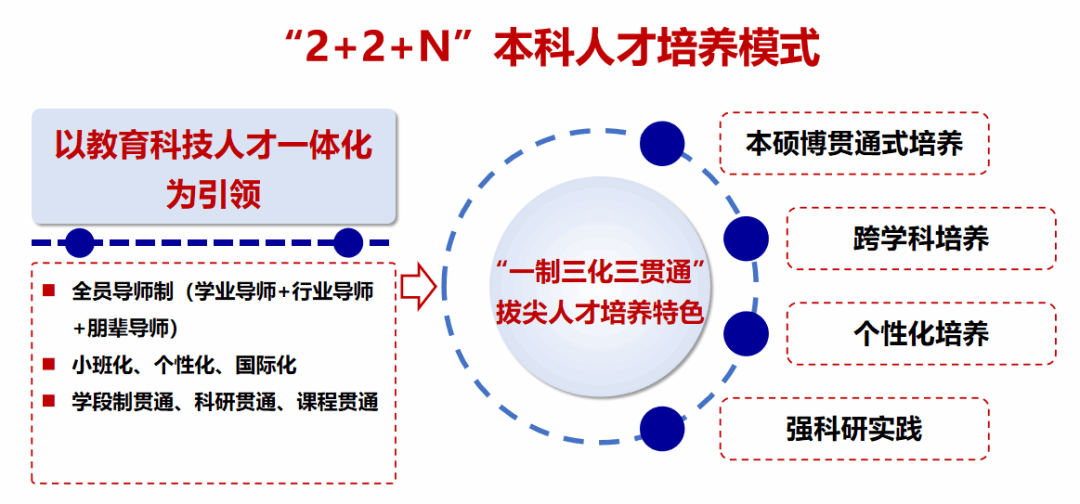 全面推进“2+2+N”人才培养模式改革,构建“通识教育+专业教育+个性化培养”三位一体的课程体系,促进通专跨深度融合,有效提升学生的综合素养与跨学科能力。强化实践环节,打造“学院+研究院+基地”科产教融合机制,鼓励专业学位论文对接区域产业需求,推进本科生“三早”培养,切实提升科研实践能力。