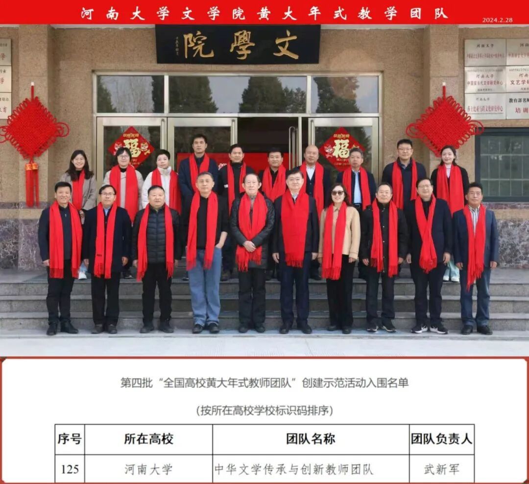 由文学院院长武新军担任负责人的“中华文学传承与创新教师团队”成功入选第四批“全国高校黄大年式教师团队”,该团队长期致力于中国文学的教学研究与文化传承,以德立学、潜心育人,是学院师资队伍建设的又一重要成果。