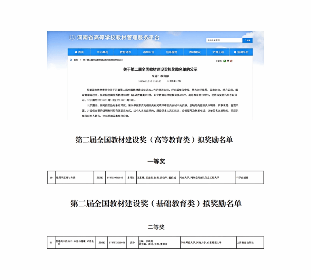 首次荣获全国教材建设奖,其中牵头主编的1部教材获高等教育类二等奖,参编的1部教材获基础教育类二等奖,实现了学校在该权威奖项中零的突破,标志着教材建设质量获得国家级高度认可。