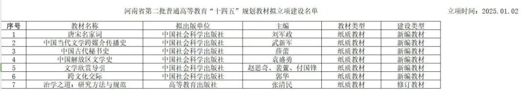 河南省第二批普通高等教育“十四五”规划教材拟立项建设名单公布,文学院共有7部教材入选,这标志着我院在教材建设与专业人才培养方面取得新的阶段性成果。