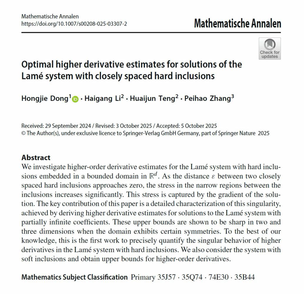 数学与统计学院张培豪在偏微分方程与材料科学交叉研究领域取得新进展,相关成果以《Optimal higher derivative estimates for solutions of the Lamé system with closely spaced hard inclusions》为题,发表在数学领域公认的国际顶级期刊《Mathematische Annalen》上。该研究聚焦于含有紧密相邻硬夹杂的Lamé系统,建立了系统解的高阶导数的最优估计。