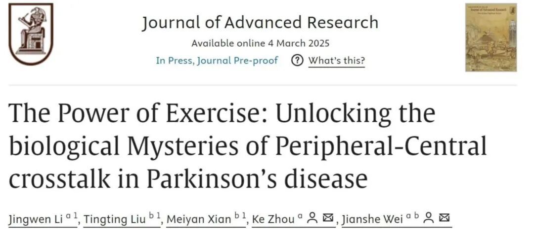 2025年3月4日,体育学院周珂教授、魏建设教授团队在国际顶级期刊Journal of Advanced Research(中国科学院一区Top,IF=11.4)发表了题为“The Power of Exercise: Unlocking the biological Mysteries of Peripheral-Central crosstalk in Parkinson’s disease”的综述论文。