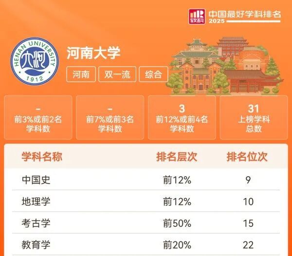2025年,历史文化学院中国史学科,登上软科排名“中国最好学科”第九位。中国史学科创建于1925年,历史悠久,积淀深厚,名师辈出,形成了先秦秦汉史、宋史、明清史、中国近现代史、黄河文明研究等特色优势学科方向,拥有中国古代史研究中心、中国近现代社会转型研究中心、宋文化研究院等重点科研平台,是河南省特色骨干学科,也被列为学校一流倍增培育学科。