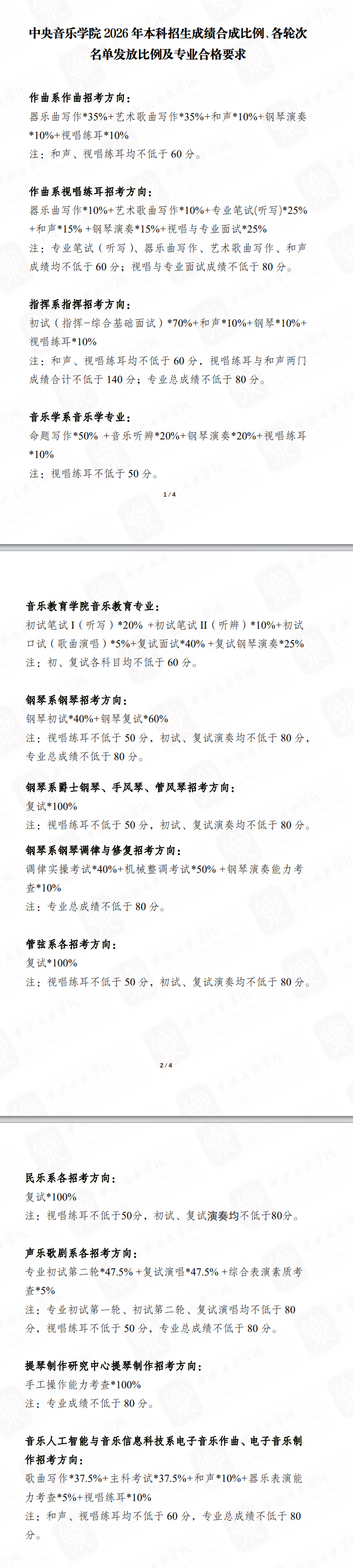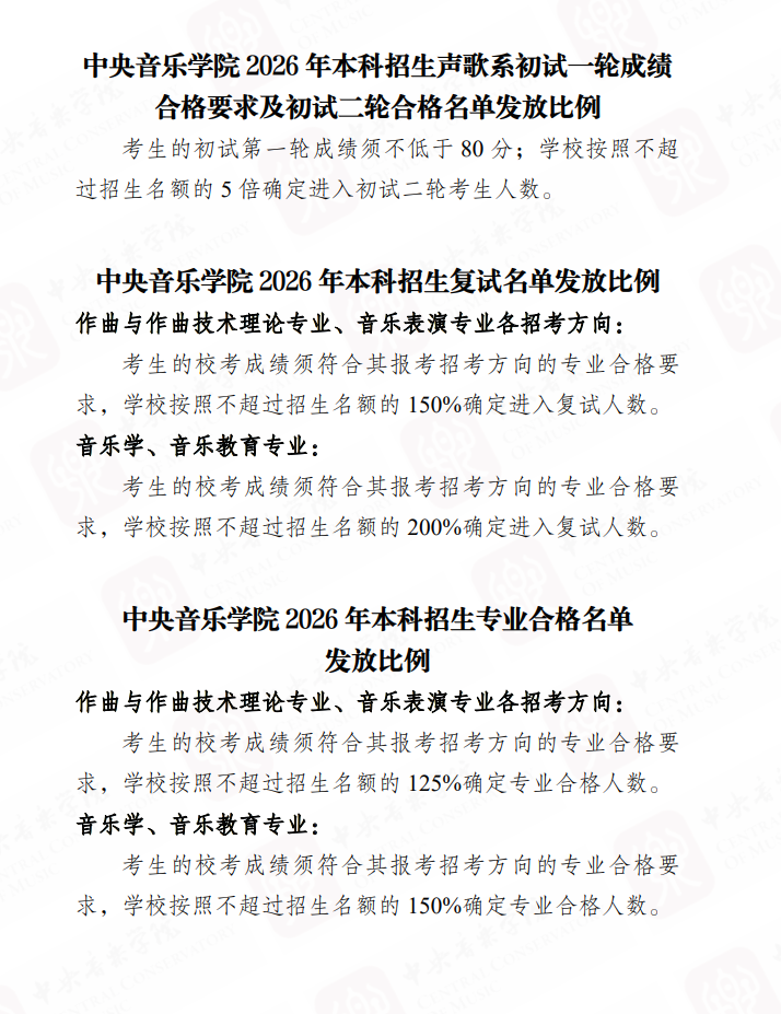 中央音乐学院2026本科招生成绩合成比例、各轮次名单发放比例及专业合格要求