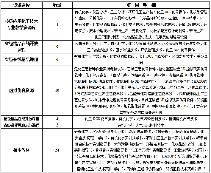 专业通过内培外引,打造了一支教科研服务水平较高、实践能力强、结构合理的“双师型”教学团队,目前有校内专任教师12人,副高级以上职称4人,占比30.8%,具有硕士及以上学位教师12人,占比100%,其中博士4人,占比30.8%,“双师型”教师比例92.3%,其中高级“双师型”教师3人,中级“双师型”教师3人,初级“双师型”教师6人。目前有兼职教师共有3人,具有中级及以上职称3人,主管或经理以上职务3人。(2)数字教学资源建设、配备与本专业相关的音视频素材、教学课件、案例库、虚拟仿真软件、数字教材等专业教学资源,种类丰富、形式多样、使用便捷、动态更新、满足教学,可支持线上教学。共建有省级精品在线开放课程8门、省级在线精品课程4门、校级精品在线开放课程4门,开发校本教材24部,拥有乙烯工艺、催化重整装置等虚拟仿真软件19套,具体见表1。 表1数字资源一览表