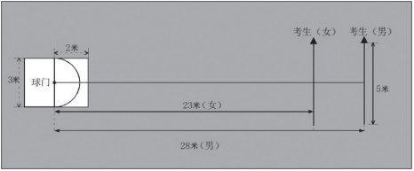 (1)测试方法:如图1所示,传球目标区域由一个室内五人制足球门(球门净宽度3米,净高度2米)和以球门线为直径(3米)画的半圆组成,圆心(球门线中心点)至起点线垂直距离为男子28米、女子23米。考生须将球置于起点线上或线后(线长5米,宽0.1米),向目标区域连续传球6次,去掉一个最低成绩,取5次成绩,左右脚均可,脚法不限。考生须在指令发出后 5 分钟内完成 测试。