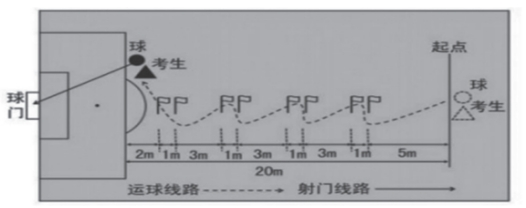 (2)评分细则:以球从起点线踢出后,从空中落到地面的第一落点为准。考生每次将球传入目标区域的半圆内(含第一落点落在圆周线上)或击中球门即得10分,考生将球传入目标区域的半圆(直径3米)以外、长方形(长3米宽2米)以内的区域内(含第一落点落在长方形除球门线以外的边线上)即得5分,未传入目标区域不得分。