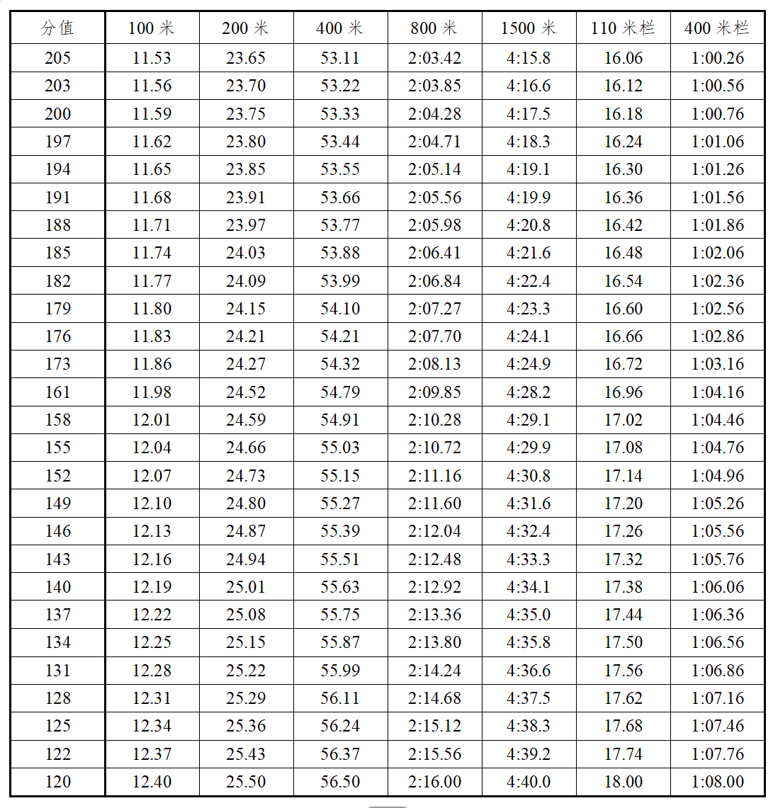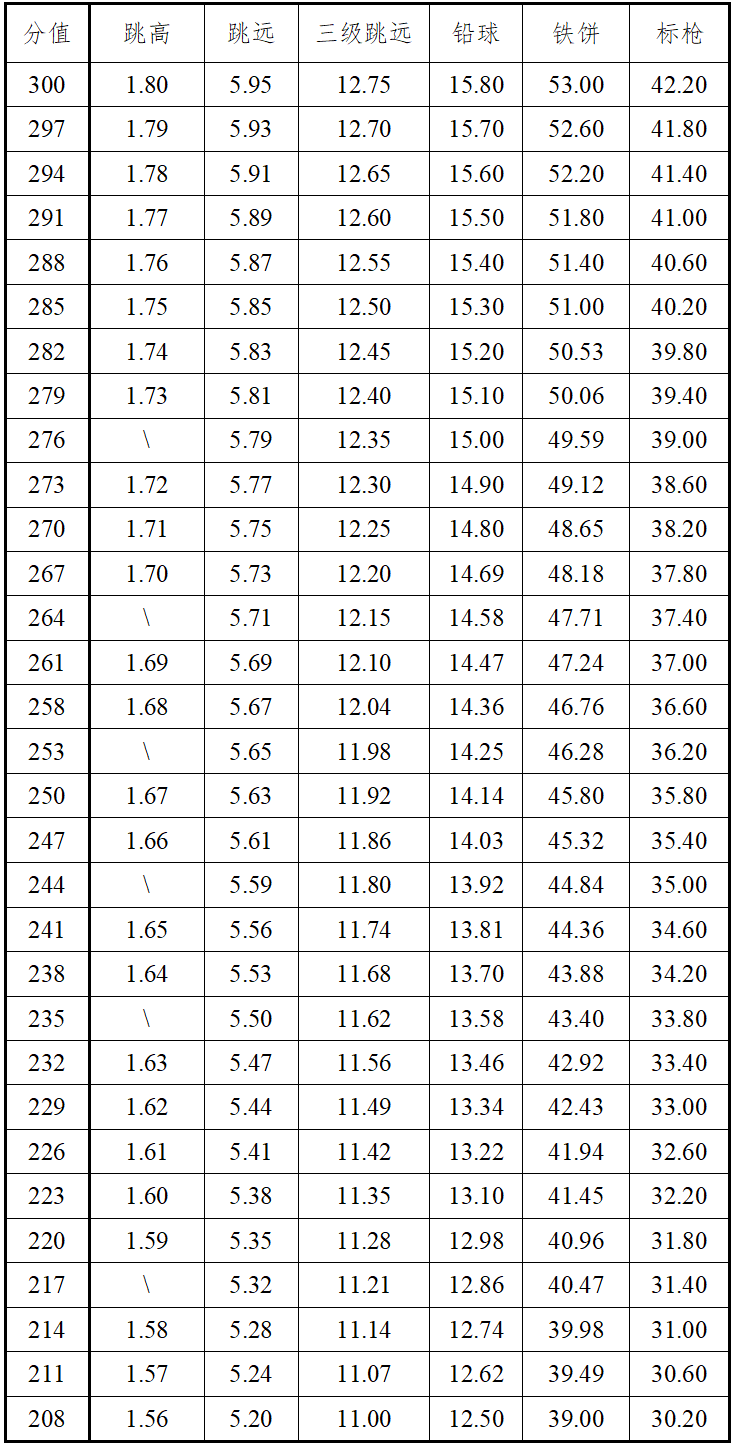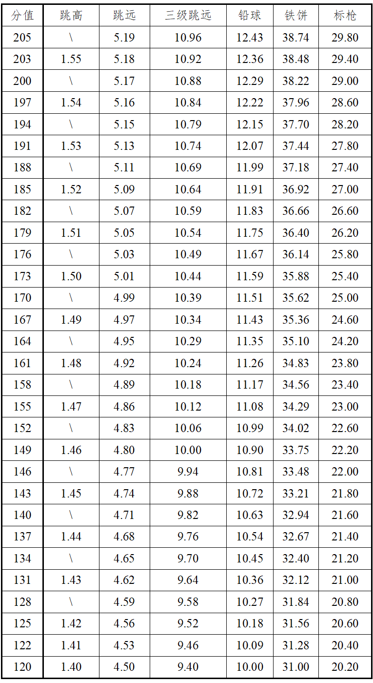 3.报考田径全能项目的考生选择男子全能项目(110米栏、跳高、跳远、1500米)或女子全能项目(100米栏、跳高、跳远、800米)进行考试。各单项得分查中国田径协会审定的《田径项目分值表》,按四项累计得分为最后得分。