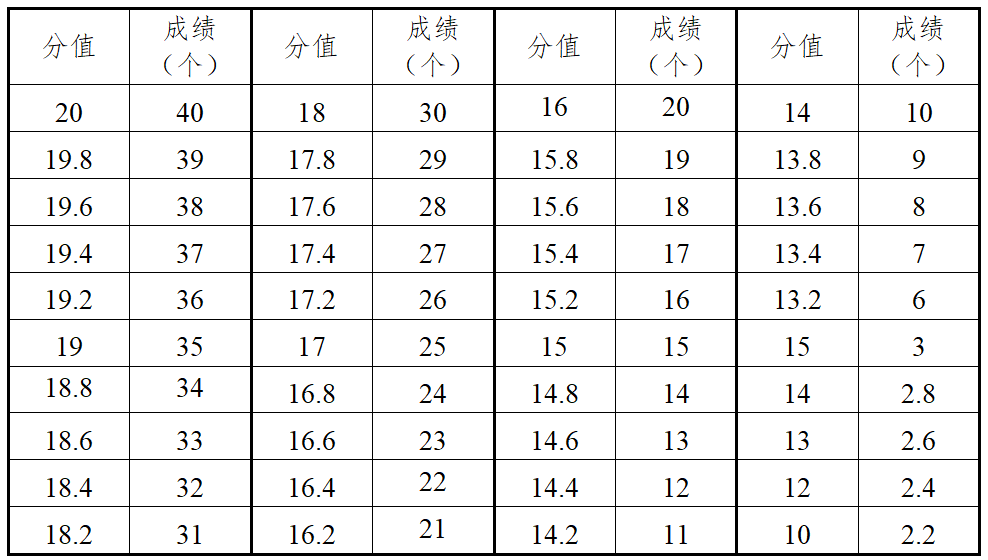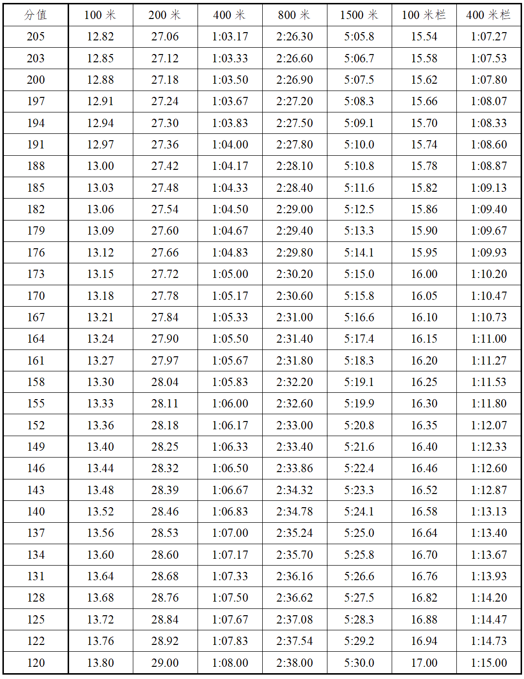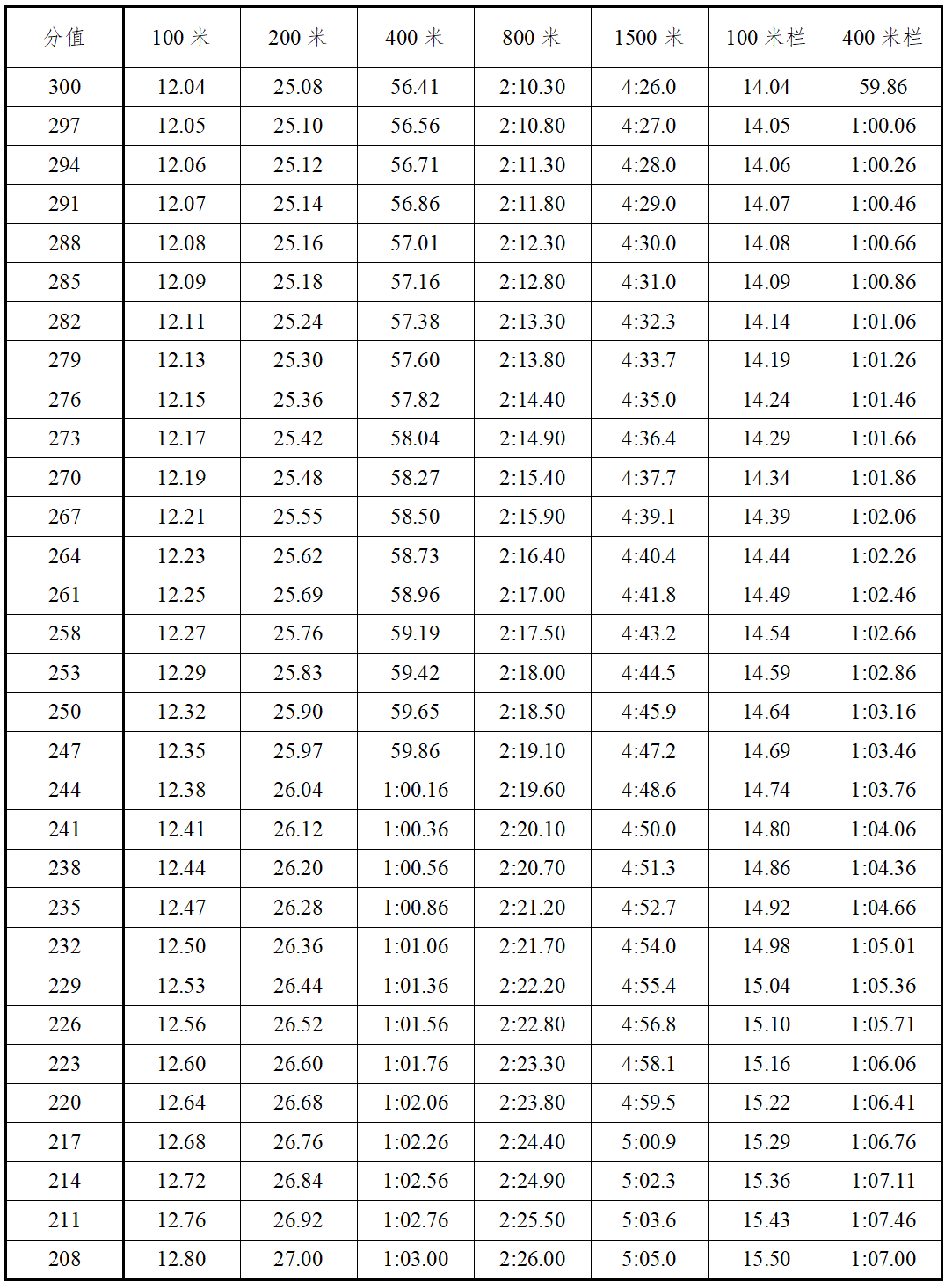 3.报考田径全能项目的考生选择男子全能项目(110米栏、跳高、跳远、1500米)或女子全能项目(100米栏、跳高、跳远、800米)进行考试。各单项得分查中国田径协会审定的《田径项目分值表》,按四项累计得分为最后得分。