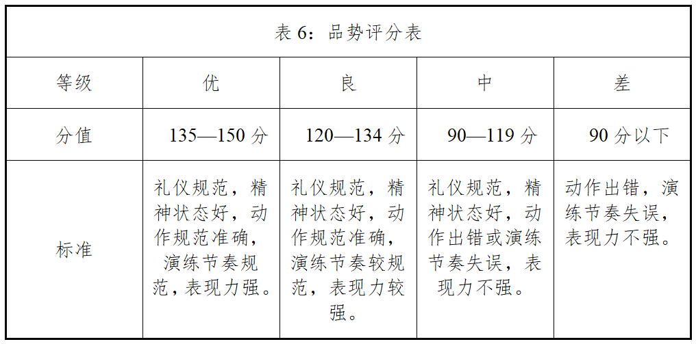 (2)评分标准:考评员参照品势评分表(表6),从动作准确度、表现力,对考生演示的动作质量、速度与力量表现、气的表现等方面进行综合评定。