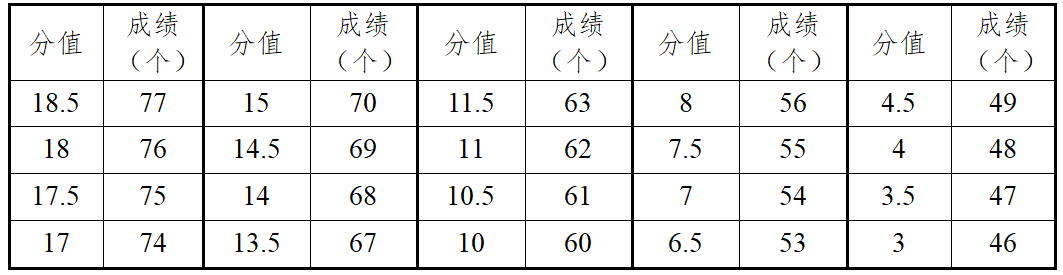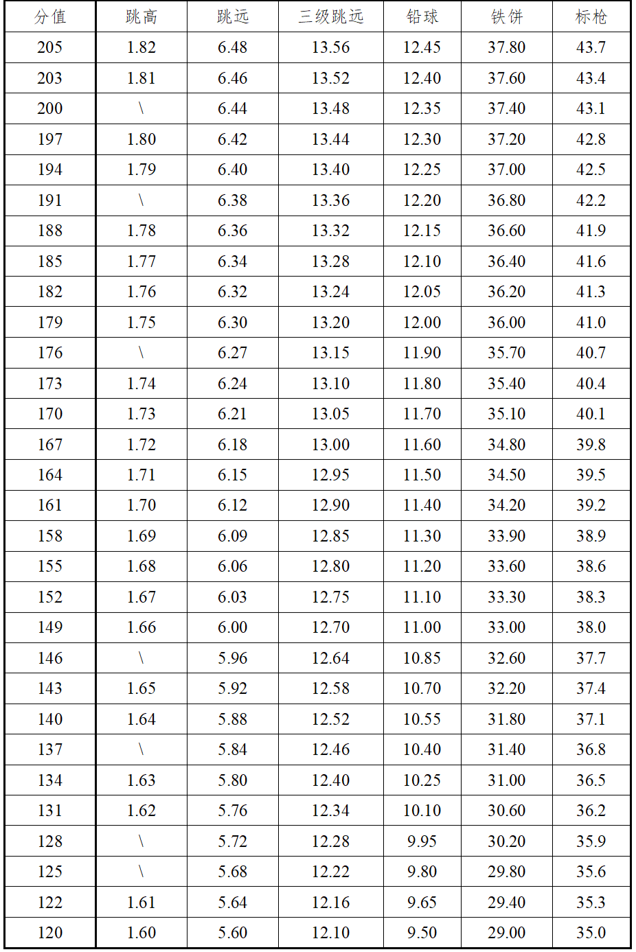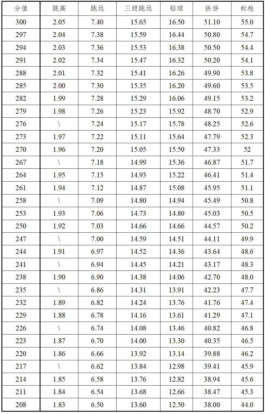 6.田赛远度项目测试时,每人均有三次试跳或试投机会,记最好成绩换算成得分。田赛高度项目测试时测试方法同远度项目,记取最后跳过高度换算成得分。