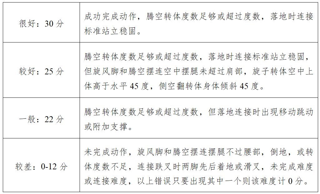 评分方法:每成功完成一个得30分,完成动作时超过度数以该难度动作的满分30分计分,未完成动作,旋风脚和腾空摆连摆腿不过腰部、倒地或转体度数不足扣15分,连接跌叉时两脚先后着地或滑叉不予计分,旋风脚和腾空摆连摆腿不过肩部扣5分,旋子转体空中上体高于水平45度扣5分,侧空翻转体身体倾斜45度扣5分,附加支撑:扣8分。