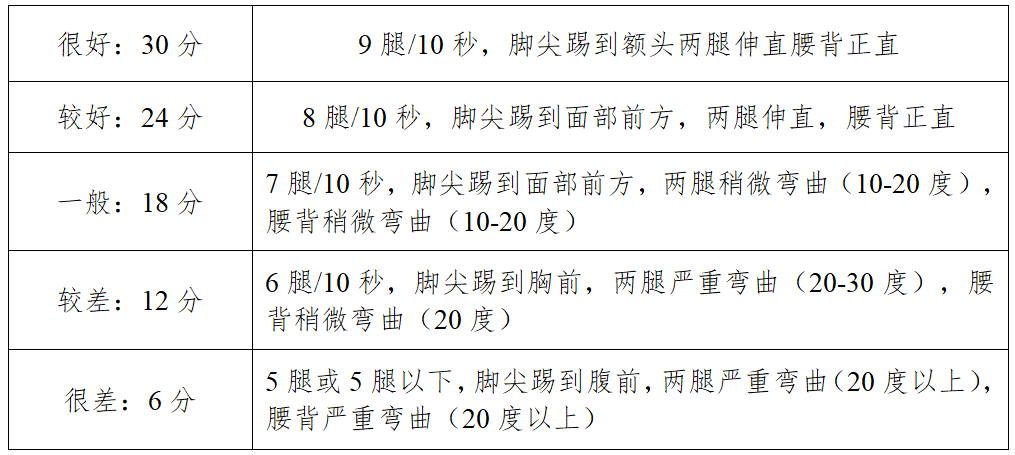 快速踢腿,左腿或右腿只测一面,由评分员临场指定。