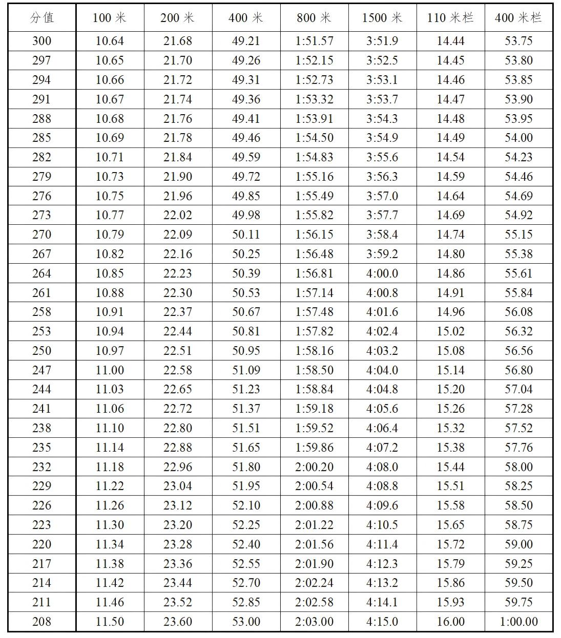 7.凡报考全能项目的考生只考四项。男子全能项目为110米栏、跳高、跳远和1500米。女子全能项目为100米栏、跳高、跳远和800米。各单项得分查中国田径协会审定的《田径项目分值表》,按四项累计得分为最后得分。