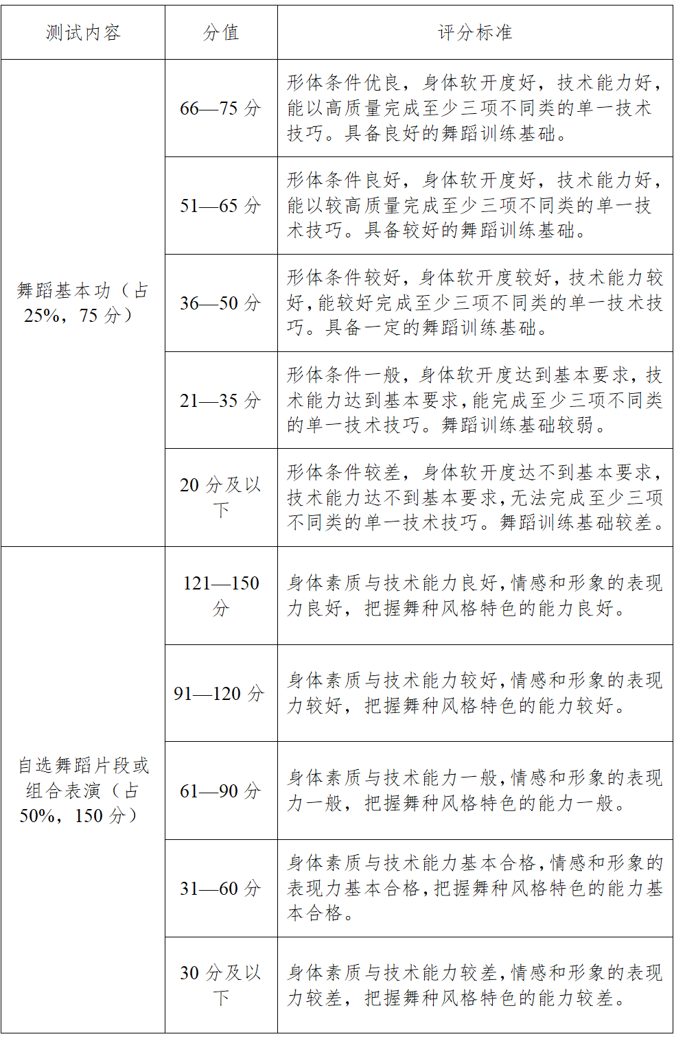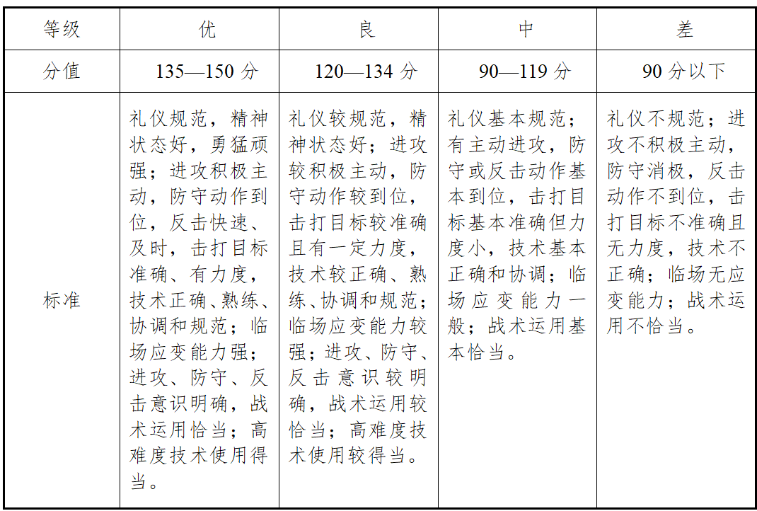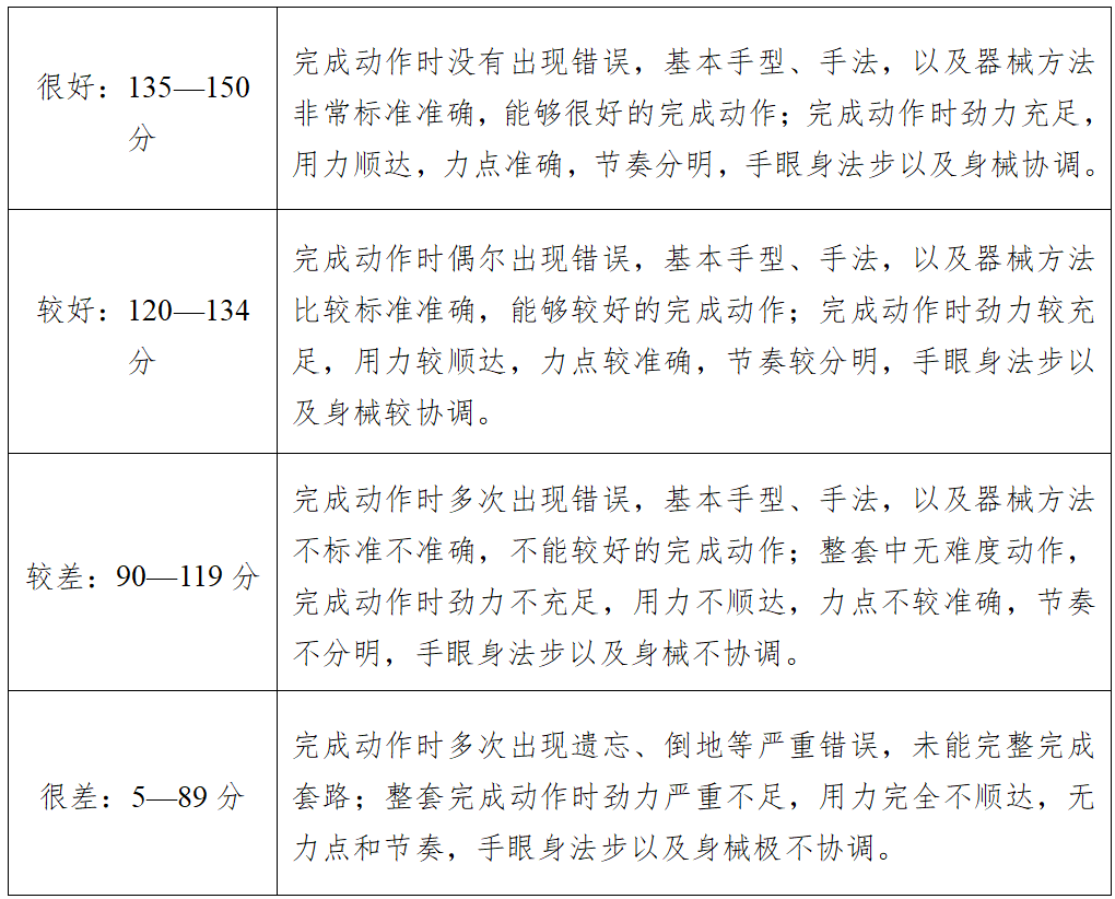 评分方法:动作质量和演练水平共150分。评分员根据测试者完成的动作质量和演练水平进行评分。