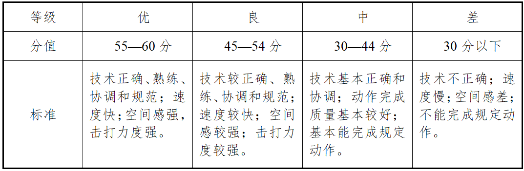 (2)评分标准:考评员参照组合动作评分表(表4),按照技术规格(速度、力量、协调、衔接转换、空间感),考生技术发挥的情况,动作完成情况进行独立评分。按10分制打分,所打分数至多可到小数点后两位。