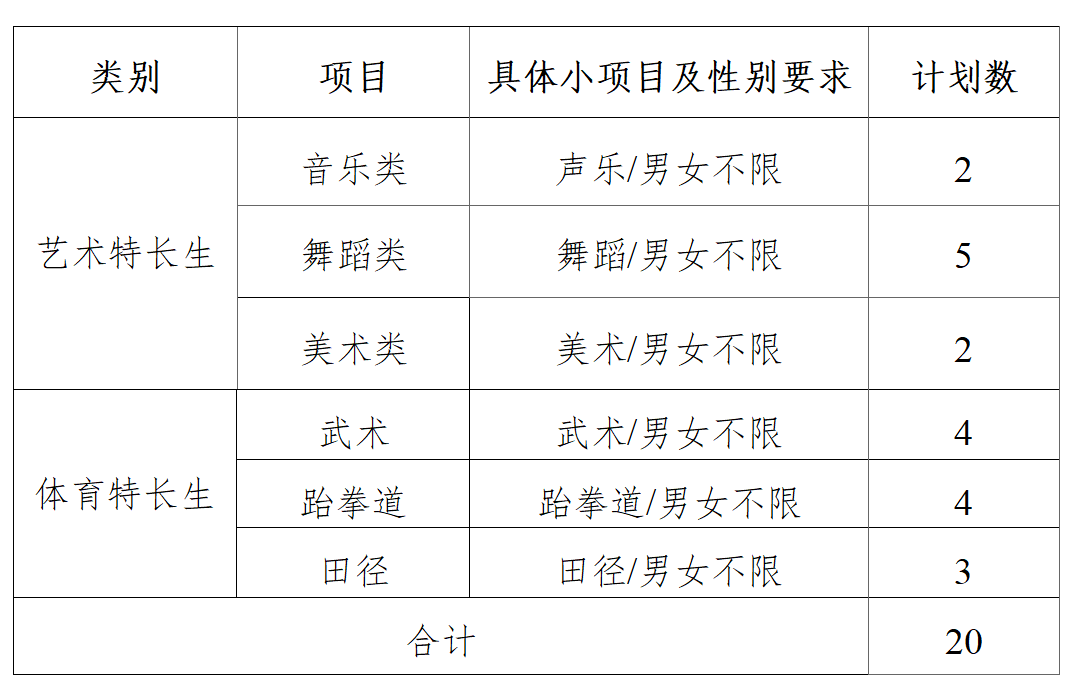 1.C类计划招收20人,考生可在上表专业范围内自行选择报考,但每个专业最多录取艺术特长生5人、体育特长生5人。若某专业符合录取条件的艺术特长生超过5人,或体育特长生超过5人,则按综合成绩从高到低依次录取,直至对应类别特长生录满5人为止。该专业录满后,如考生选择服从专业调剂,可调剂至其他未满额专业;如不服从调剂,则不予录取。