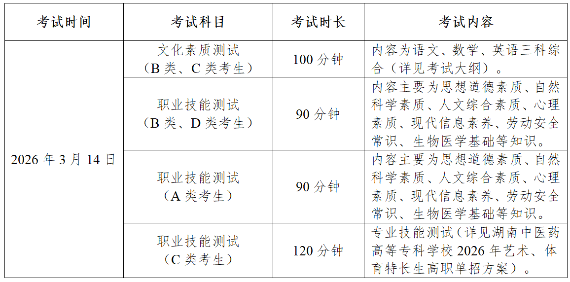 3.C类考生。由学校统一组织文化素质测试和专业测试。文化素质测试由学校依据《中等职业学校公共基础课课程标准》及高中教育阶段语文、数学、英语等有关内容进行命题及考试,采取上述B类考生笔试的方式进行,满分300分。专业测试按照附件一《湖南中医药高等专科学校2026年艺术、体育特长生高职单招方案》执行,满分300分。两部分测试成绩总分(即综合成绩)为600分。