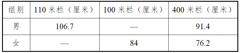 8.跨栏采用的栏架高度和投掷项目所使用的器材重量,均以最新国际田联田径规则规定的成人比赛器材规格为标准(表1.1和表1.2)。