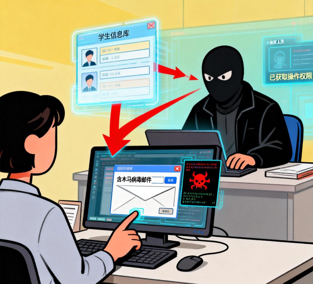 诈骗分子先向校园工作人员发送含木马病毒的邮件,一旦被点击,就能远程控制电脑,窃取操作权限。他们甚至能直接获取学生信息库!
