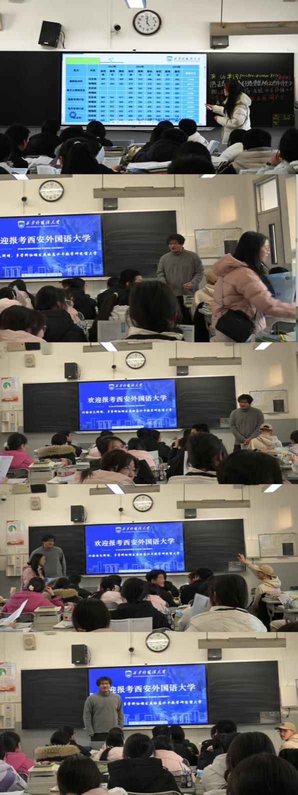 前期,团队积极与渭南市杜桥中学的校方及班主任取得联系,确定了利用班会时间进入班级进行宣讲。团队成员共同策划方案,围绕西安外国语大学的办学特色、优势专业及校园文化,精心制作了宣讲PPT与短视频,并为同学发放了校方准备的招生简章、纪念本等宣传物料。