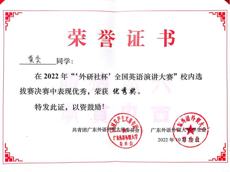 获奖情况:连续三年获校级综合二等奖学金、校级“优秀学生骨干”荣誉称号等,在“外教社·词达人杯”全国大学生英语词汇能力大赛、“‘外研社杯’全国英语演讲大赛”校赛、“三进”专题英语教育学院语音语调大赛等赛事中获奖