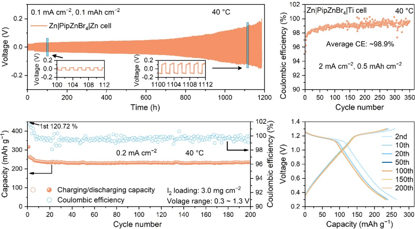 以PipZnBr4为固态电解质的Zn||Zn对称电池测试显示,在0.1 mA cm⁻²的电流密度下,能稳定循环超过1100小时,就算电流密度提高到0.5mAcm-2和1.0mAcm-2,依然能稳定运行,证明了该电解质具备可靠的离子迁移能力和界面稳定性。