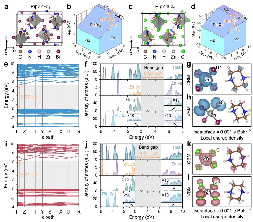 基于上述策略,研究人员通过理论计算筛选并设计出两种目标材料——C4N2H12ZnBr4(简称PipZnBr4)和C4N2H12ZnCl4(简称PipZnCl4)。理论分析显示,这两种材料都具备成为优质固态电解质的潜力:具有良好的热力学稳定性,表明材料易合成且稳定;具有宽的带隙,表明材料具有低的电子电导率,不会出现电子“乱跑”导致电池自放电的问题;具有丰富的卤素空位缺陷,表明材料易因为缺陷破坏原有的锌-卤四面体结构,可能为锌离子传导提供更多空间;具有较低的迁移能垒,表明材料具备良好的锌离子传导能力。