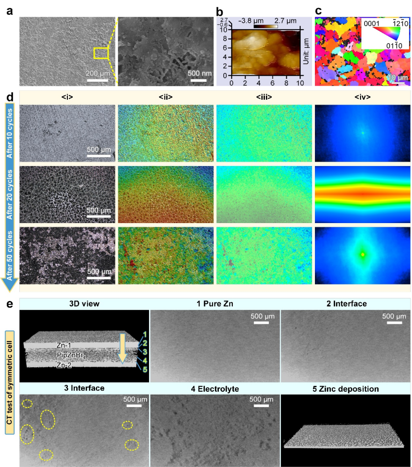 除此之外,这种电解质还能解决锌枝晶的关键难题。通过多尺度表征证实,PipZnBr4电解质可诱导锌均匀致密沉积。SEM、AFM与CLSM显示,循环后锌呈球形多晶形貌,表面粗糙度低(20次循环后仅0.9μm),且随循环趋于平整;EBSD表明,晶粒取向随机,从根本上有效抑制枝晶生长。CT无损成像显示,锌和电解质界面紧密接触,无孔洞或穿透,不会出现接触不良的问题。XPS分析表明,电池循环过程中,界面原位形成有机外层/无机内层的稳定固态电解质界面(SEI),能促进锌离子均匀传输。XRD与XPS进一步验证电解质在循环中结构稳定,元素环境变化微弱,整体展现出优异的界面兼容性与沉积可逆性。