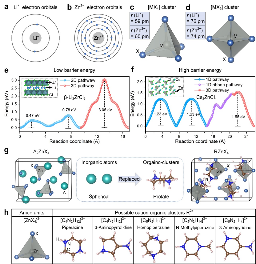 研究团队发现,虽然金属卤化物固态电解质在锂离子电池中已经应用得很成功,但这套设计思路没法直接搬到锌电池上。为了探究根源,研究团队从锂卤化物材料与锌卤化物材料的子结构层面入手,通过理论计算对比发现:锂-卤素键以离子键为主,利于锂离子迁移;而锌-卤素键具有更强的共价性,将锌离子牢牢锁住。基于这一关键认识,团队创新性地提出了“成分工程”策略:用体积较大、空间结构松散的有机阳离子,替换传统三元锌卤化物中的无机阳离子,从而削弱锌离子迁移的强共价键,并提供锌离子传输通道,让它能顺畅通过。