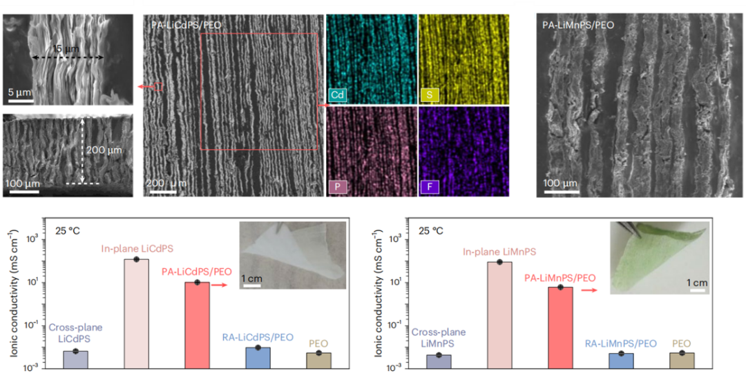在此结构设计下,成功解决了LiMPS纳米片内锂离子传输的各向异性问题,充分利用了其面内高离子电导率。形成的二维连续超离子传导通道使PA-LiCdPS/PEO的室温离子电导率达10.2 mS cm-1,比无序排列的RA-LiCdPS/PEO的9.6 × 10-3mS cm-1高出三个数量级。具有同样结构设计的PA-LiMnPS/PEO电解质的室温离子电导率为6.1 mS cm-1。此外,PA-LiCdPS/PEO和PA-LiMnPS/PEO电解质都表现出类似聚合物的机械柔韧性,有利于与电极保持紧密接触。这与高模量、极低变形能力(<0.5%)的传统高导无机电解质形成了鲜明对比。