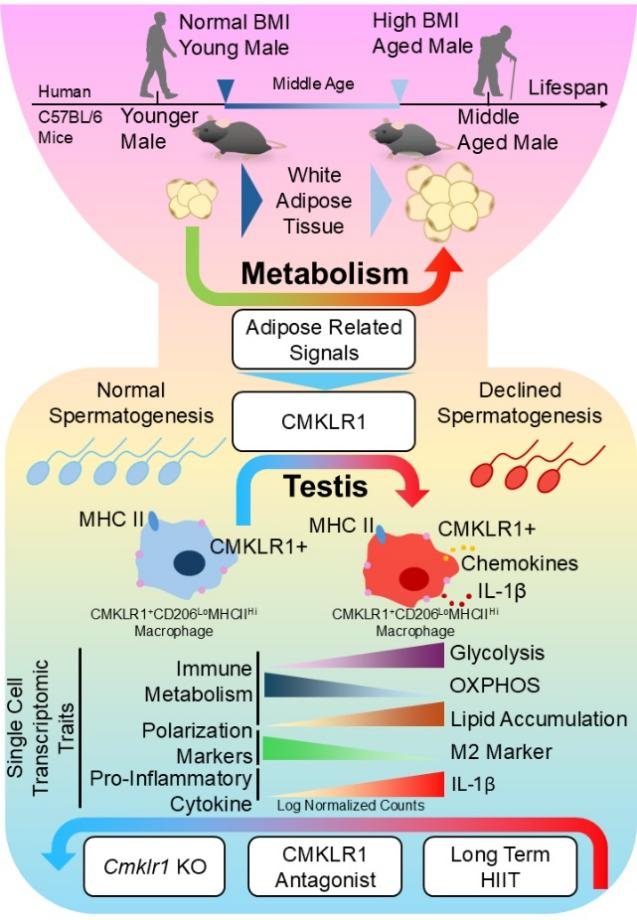 中年衰老过程中脂肪组织信号经CMKLR1调控睾丸巨噬细胞代谢-免疫状态及其干预机制示意图