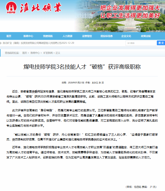 近日,安徽省国资委网站发布信息,淮北煤电技师学院工匠大师工作室核心成员扣红卫、谢彪、纪海矿凭借精湛技艺与突出业绩,“破格”获评2025年度安徽省工程系列副高级职称。此前,该院工匠大师杨杰以同样方式获评正高级工程师。至此,该院已有四位顶尖技能人才实现职业发展的重要跨越。